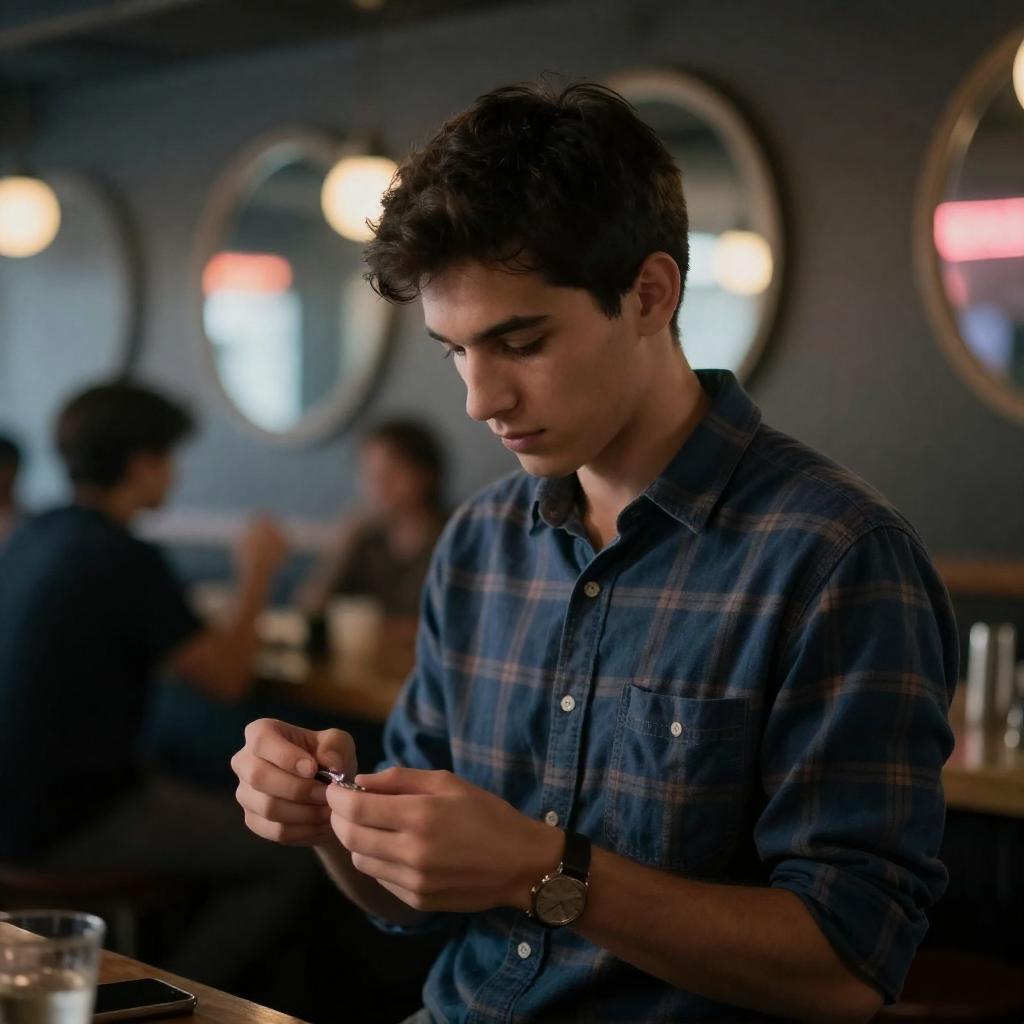 Photograph of a young man with dark brown hair, wearing a navy sweater over a patterned shirt, leaning forward. Background shows a classroom with several students seated at desks, working. Reflective window shows outside light. Intense focus on young man.