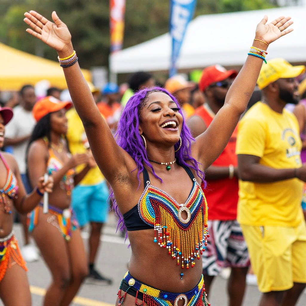A vibrant photograph of a lively street parade. In the foreground, a smiling Black man in a rainbow-striped shirt holds a phone, while a person beside him wears a dramatic, colorful costume with a bright orange, feathered headdress and painted white face. The background is filled with a crowd and buildings, capturing the festive atmosphere. The colors are vivid and the scene is energetic.