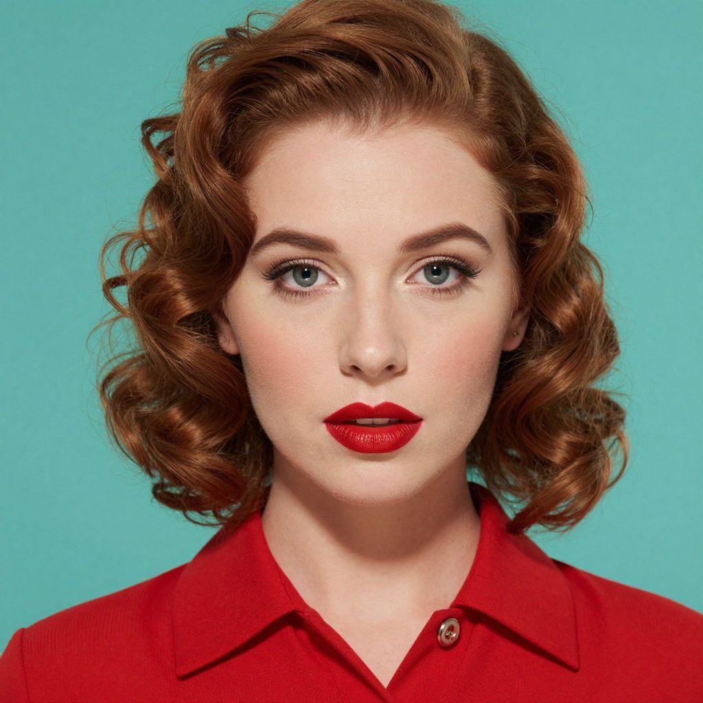 Close-up portrait of a young woman in retro vintage 1950s style, featuring voluminous curled auburn hair, bold red lipstick, and a vibrant red button-down shirt against a teal background.