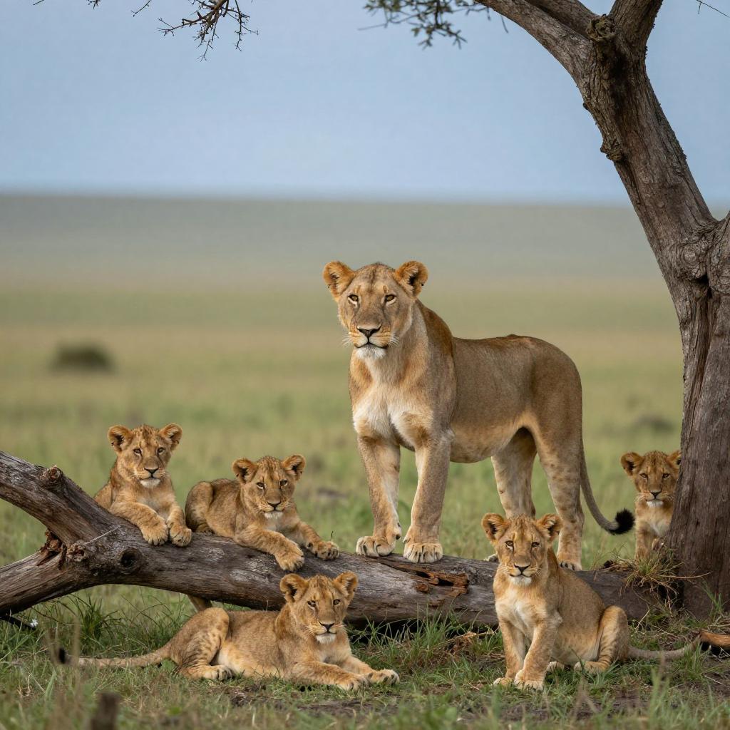 Photograph of a savanna scene featuring five lions. A standing lioness with a focused expression is in the center, while three cubs are scattered around a fallen tree trunk in the foreground. One cub is lying on the trunk, and another is partially hidden behind it. The background shows a vast, flat grassy plain under a clear blue sky. The lions' tawny fur contrasts with the green grass and brown tree.