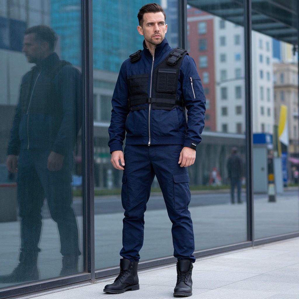 A man, asymmetrical zip-up jacket, tactical vest overlay, slim cargo trousers, urban-inspired ankle boots, deep navy blue, modern glass structure, sleek design, vibrant city backdrop, camera obscura style, contemplative expression.Man has masculine face and piercing eyes