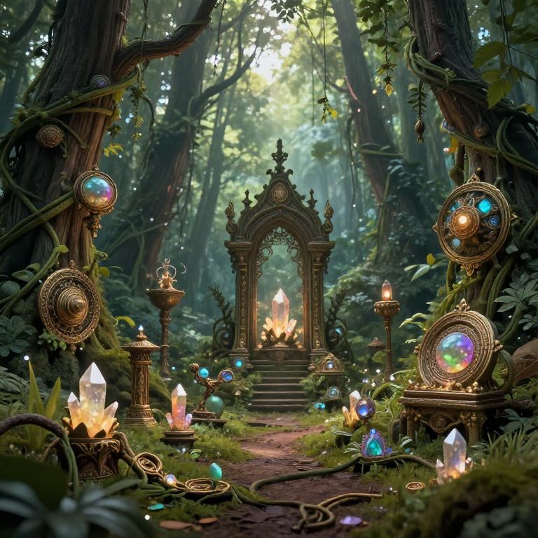 Intricate parafinalia assembled in a mystical forest clearing, ancient magical relics intertwined with natural elements like vines and glowing crystals, ethereal ambiance with soft light beams penetrating through dense foliage, fantasy art style with rich colors.