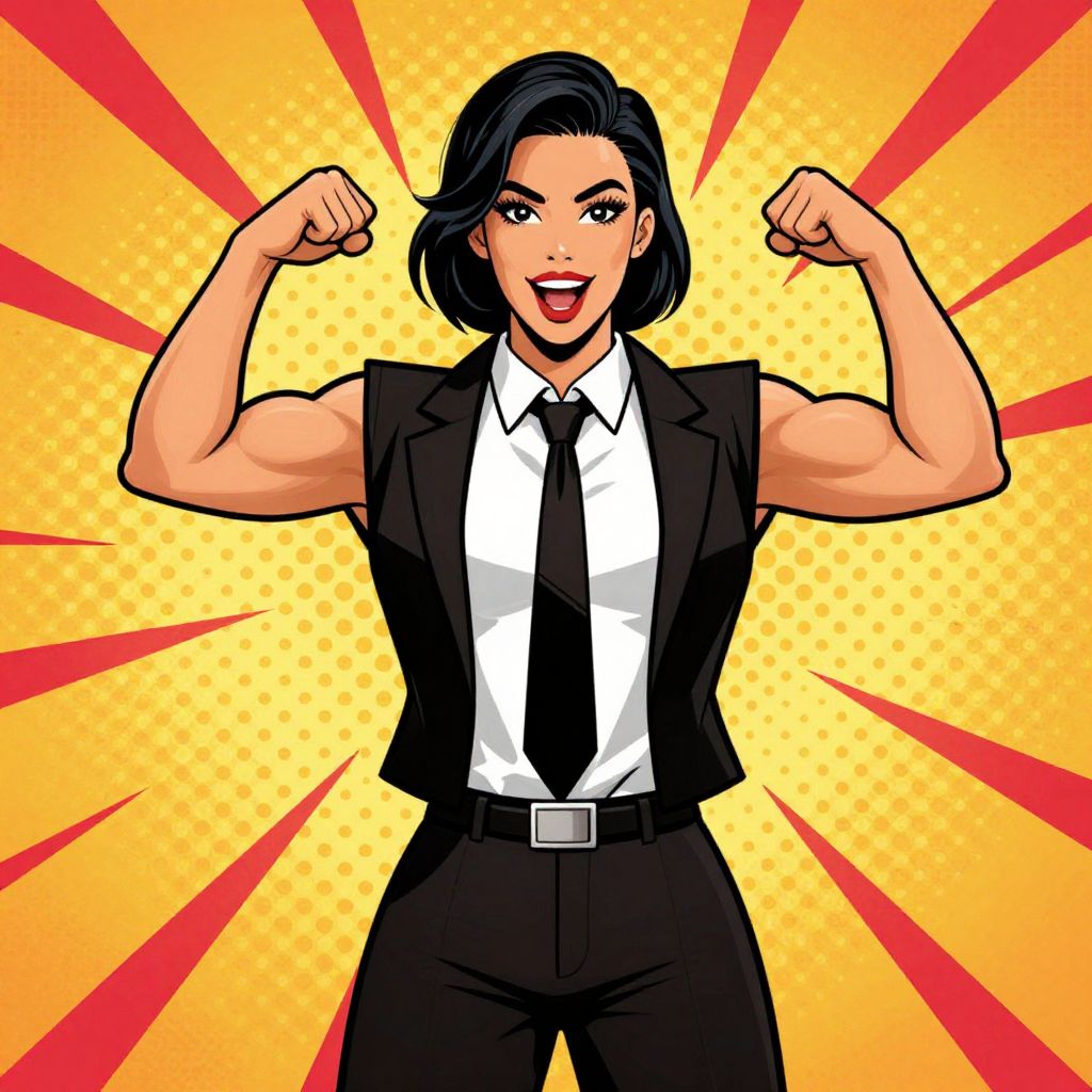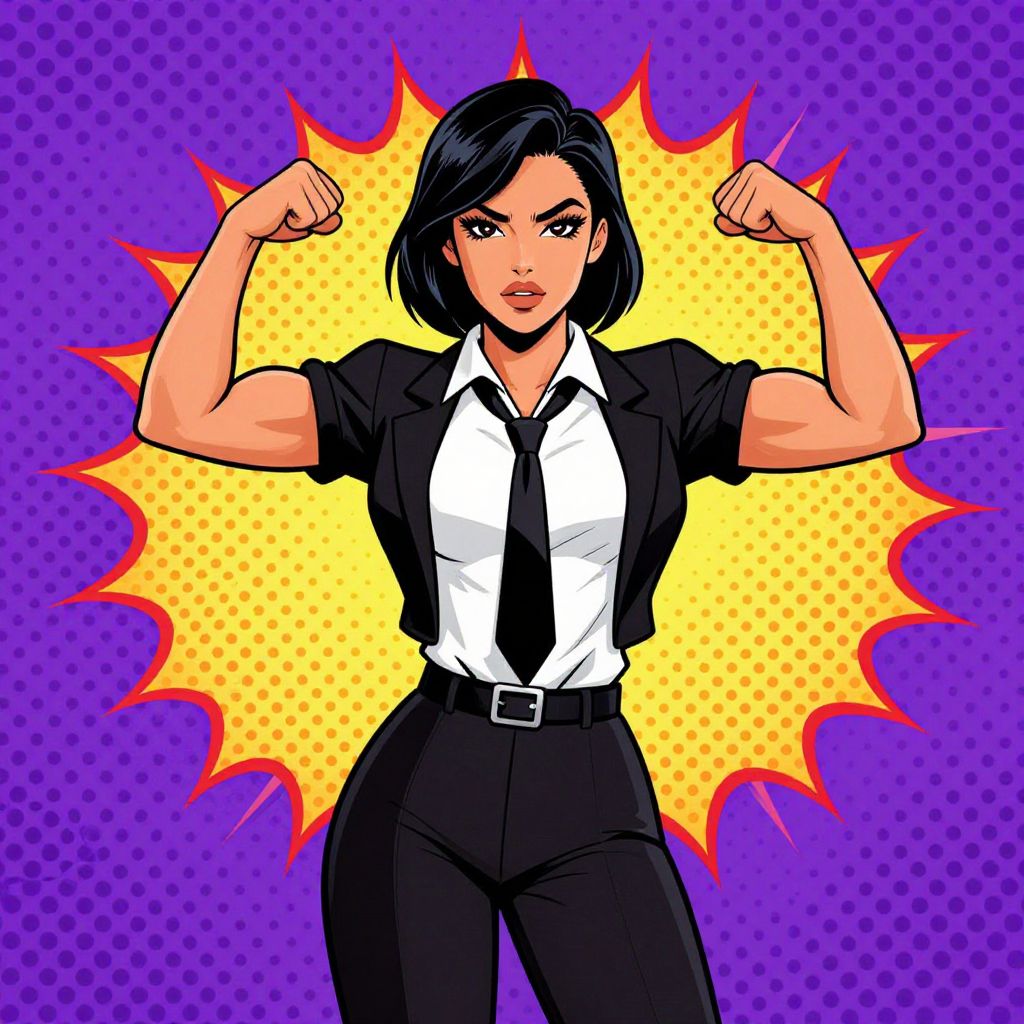 Colorful comic-style illustration of a muscular, confident woman with black hair, sleeveless black suit, white shirt, black tie, flexing arms,