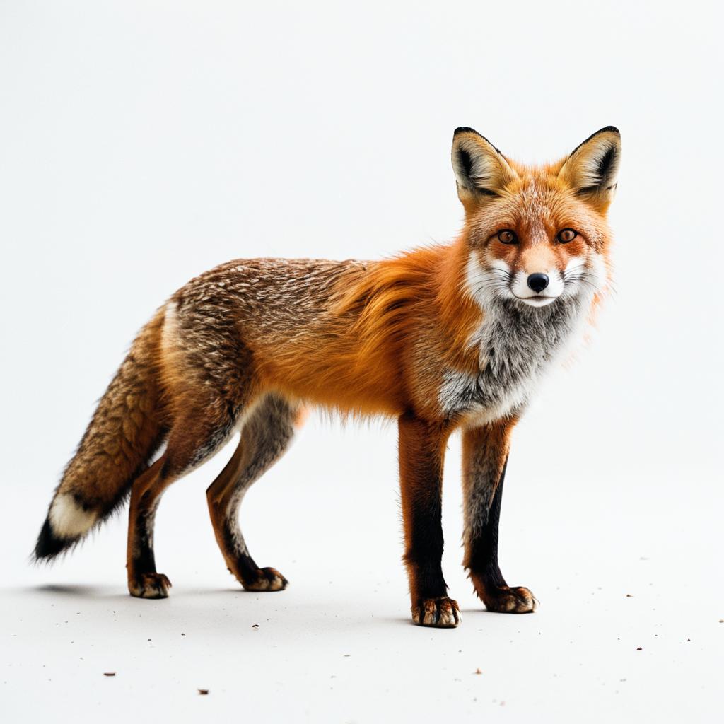A full-body, side-view shot of a red fox, on a white background, cinematic lighting, natural kodak-film tone, hyper-realistic details, vibrant and beautifully color-coded