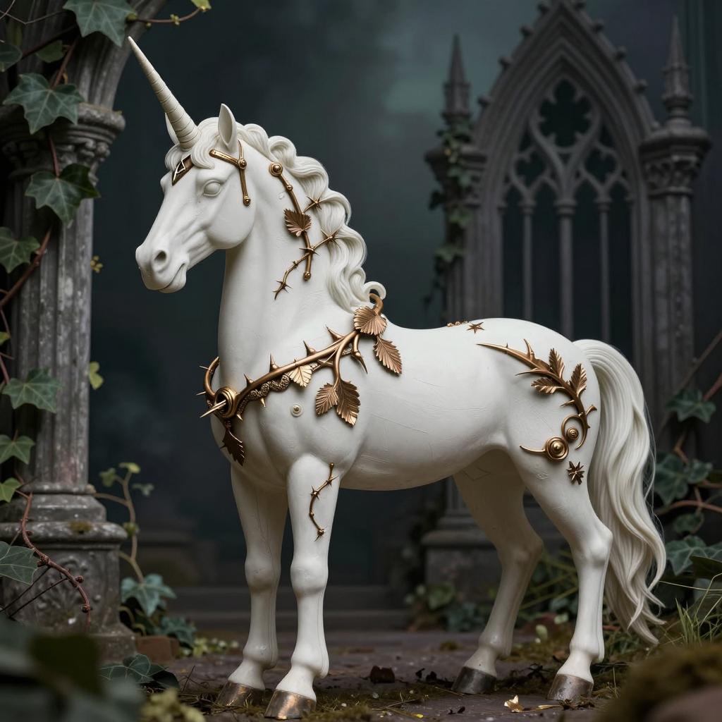 A photorealistic depiction of an ancient abyssal unicorn adorned with intricate skeletal and bronze decorations. The unicorn is white with sculpted details and highlighted by a complex design of intertwined bronze leaves, thorns, and geometric elements. The background features dark ivy leaves and stylized gothic architectural shapes creating a surreal and mystical atmosphere, inspired by Moebius and Enki Bilal styles.