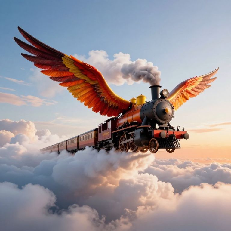 Phoenix-shaped steam engine soaring above the clouds, its vibrant wings spread wide as it billows smoke and propels a train labeled \"CARDING\" through a fantastical sky filled with fluffy white clouds and a gradient of blue and orange hues.