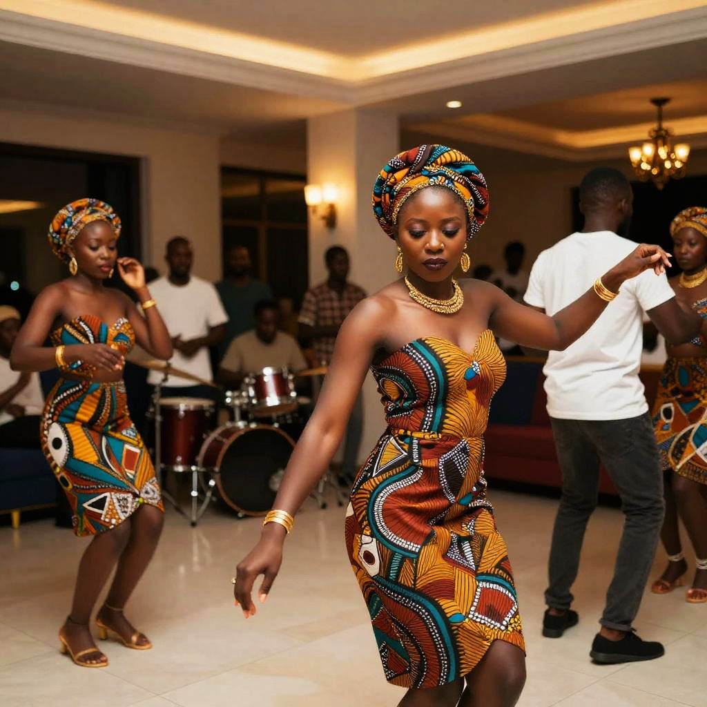 Mandingo party indoors with elegant décor, guests enjoying music and dancing, African-inspired patterns, rich textures, ambient lighting, realistic style, vibrant and dynamic composition