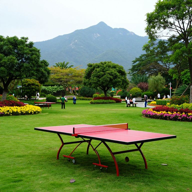 Lush green lawn stretches beneath vibrant trees and colorful flowerbeds, with a red-and-white ping pong table at its center, surrounded by people enjoying the serene park setting against a backdrop of majestic mountains.