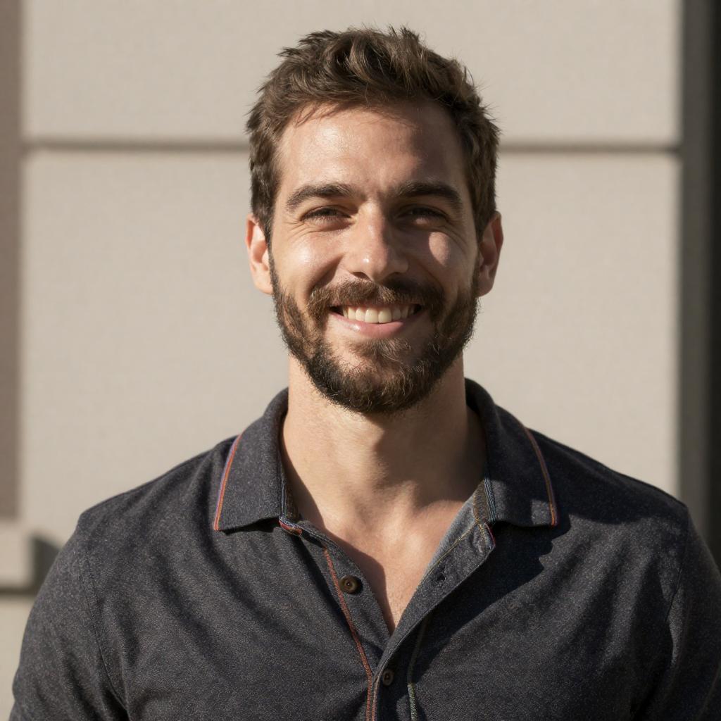 Photograph of a smiling man with medium-length dark hair and a beard, wearing a light blue, slightly open, button-up shirt. He has a warm, friendly expression and is set against a blurred, bright background. The image has a high-contrast, vibrant color style.