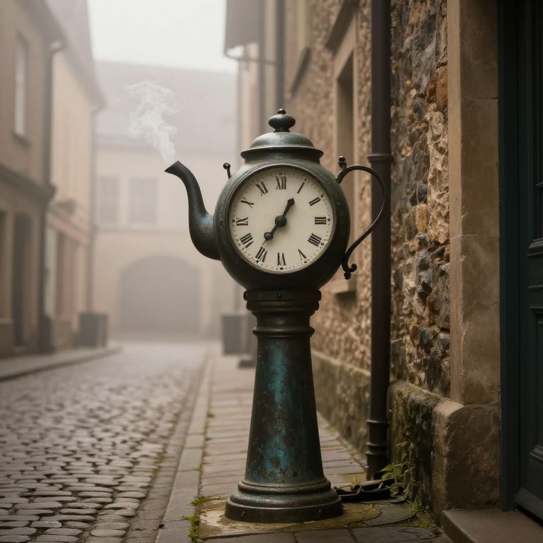 An ancient teapot clock stands sentinel in a misty alley, its steaming spout whispering forgotten tales of time's relentless march, while the cobbled streets echo with the weight of history and the warmth of nostalgia.