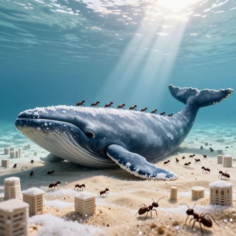 An army of ants marches in silent harmony atop the slumbering form of a colossal whale, their industrious cities of sugar and sand a testament to resilience, while the ocean whispers secrets of eternity beneath a sky that mirrors their boundless ambition.