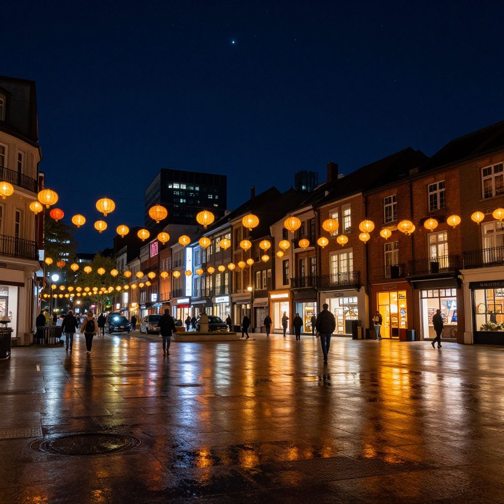 City late night aesthetic, bustling city square under a starry sky, soft glowing lanterns and illuminated storefronts, vibrant reflections on pavement puddles, atmospheric urban scene with diverse architecture blending tradition and modernity