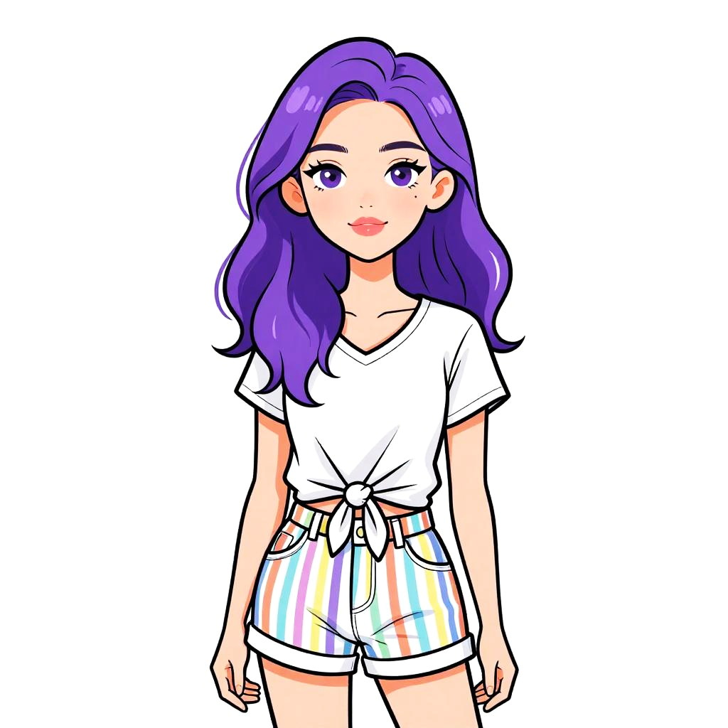 Woman with pretty face and pretty hair. Woman, casual summer, sleeveless square-neck crop top with matching high-waisted shorts, vertical thin pinstripe pattern in white and light beige, thin shoulder straps, plain white background. --sref 1467