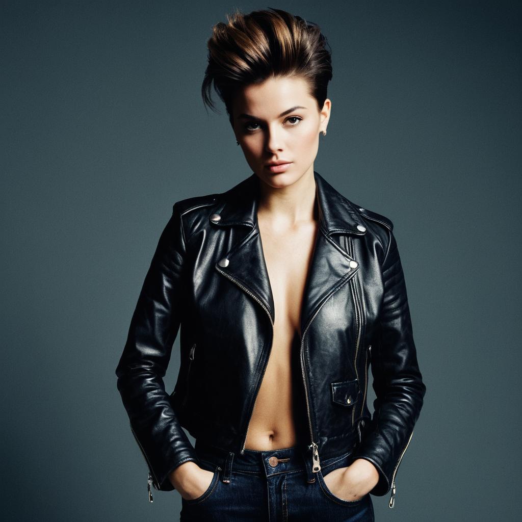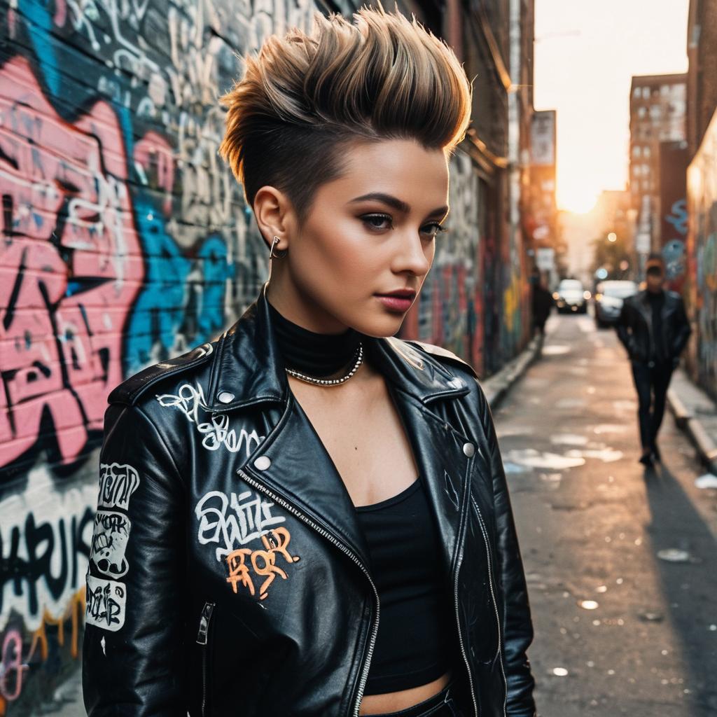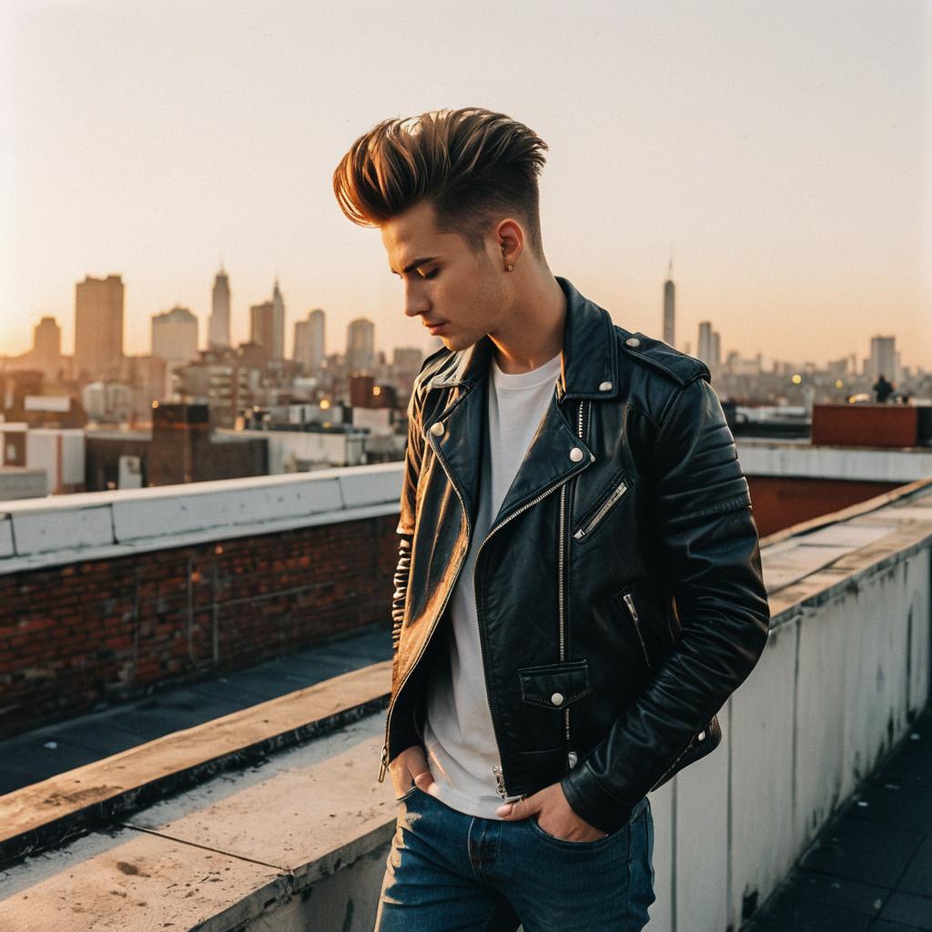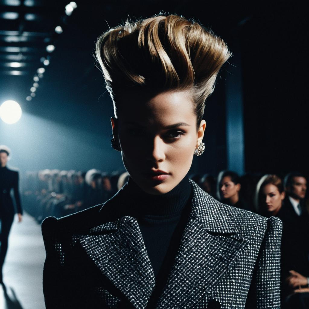 Pompadour hairstyle on fashion model, wearing formal gown, in luxury hall, captured in fashion editorial style with soft golden hour.