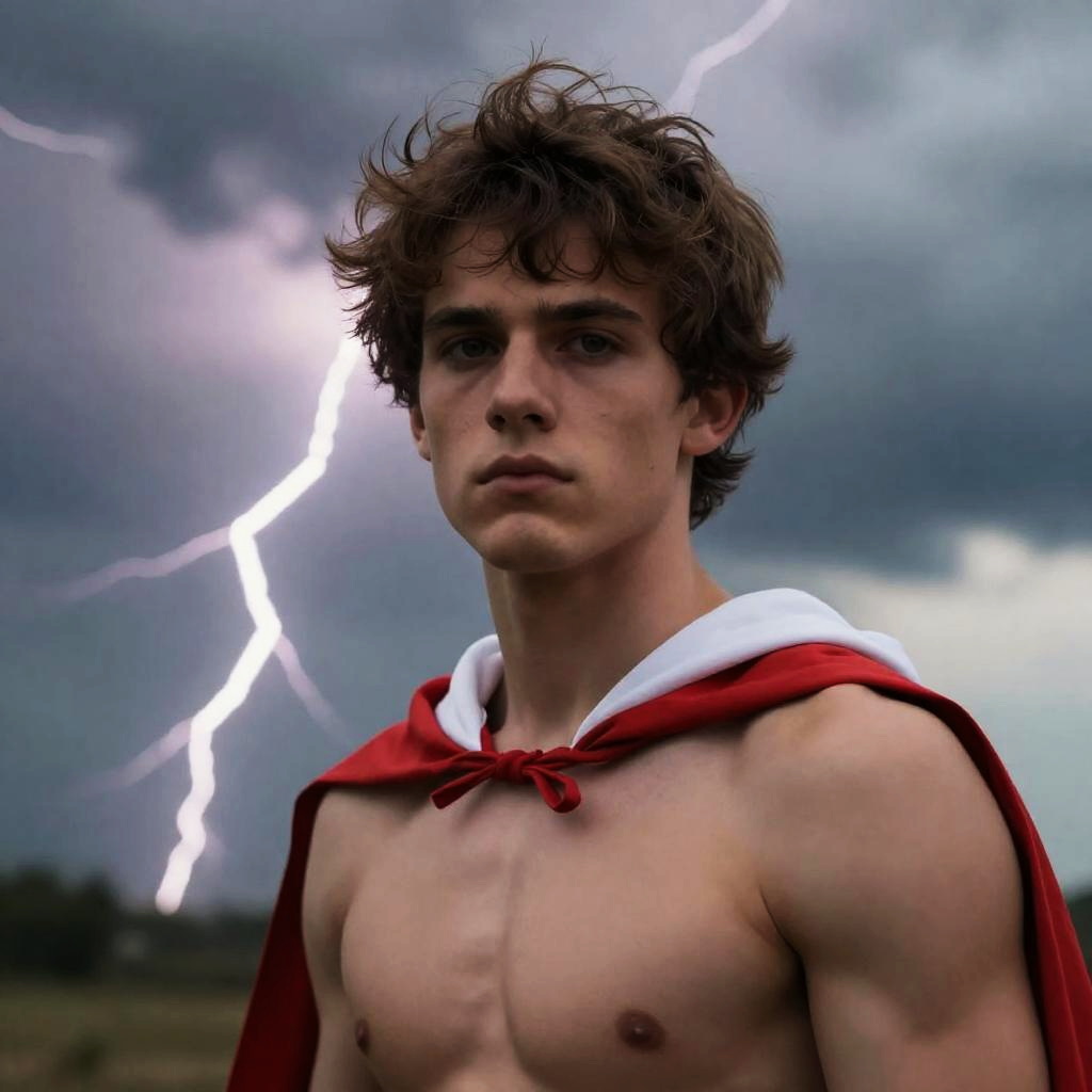 Photograph of a young man with shaggy brown hair, intense gaze, and muscular shoulders. He wears a red and white cape. Lightning bolts illuminate a cloudy, stormy sky in the background. His expression is determined and focused.