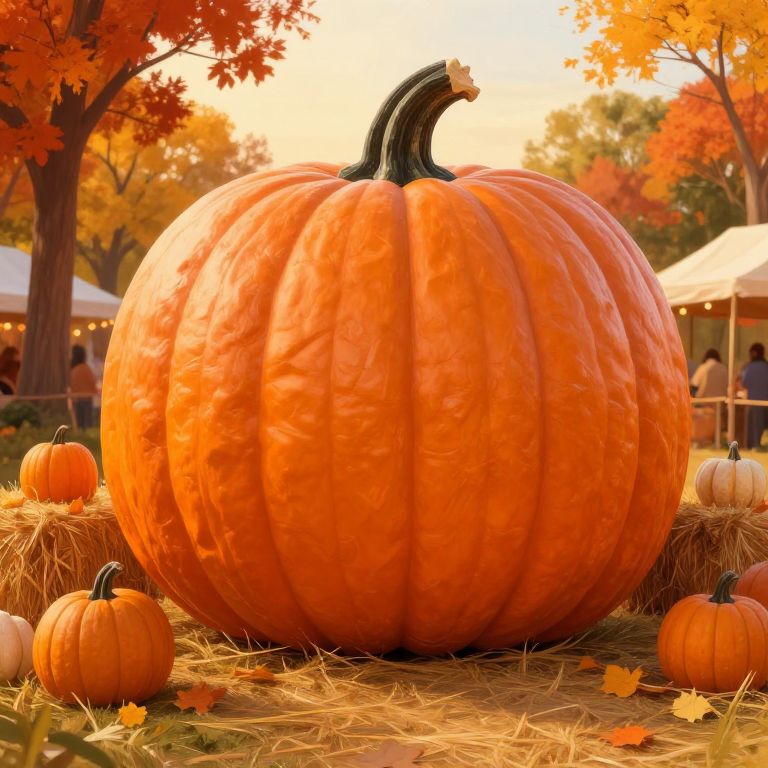 A colossal 400lb pumpkin in a rural autumn festival setting, surrounded by hay bales, pumpkins and vibrant fall foliage, warm golden light, inviting and festive mood, painterly style with rich textures