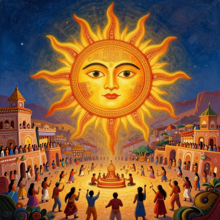 Inti, the sacred sun deity, shown as a glowing anthropomorphic sun with intricate Incan patterns on its surface, illuminating a bustling ancient city below with people celebrating a solar festival, painted in a rich, colorful style.