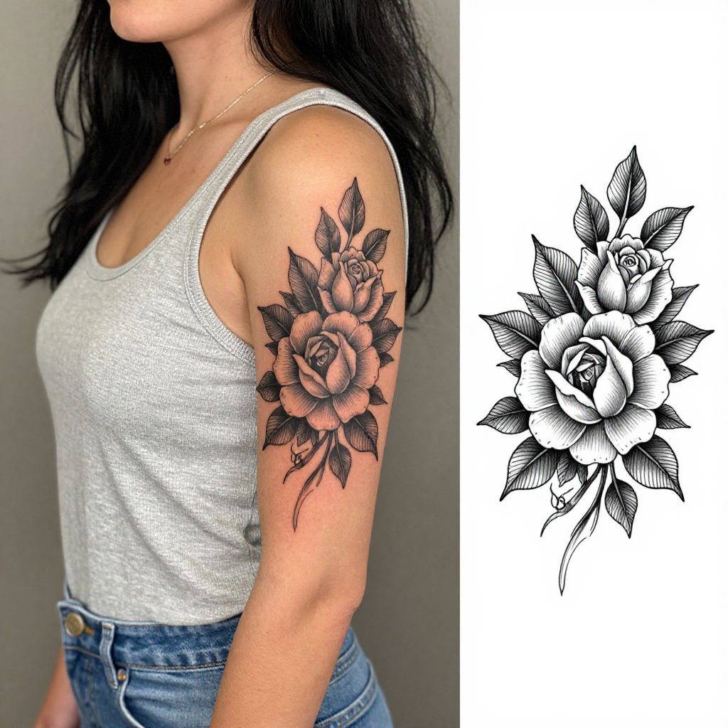 Photograph of a woman with long dark hair, wearing a gray tank top and blue jeans, showcasing a black floral tattoo on her left upper arm. The tattoo features detailed roses and leaves. To the right, there's a black and white close-up of the same tattoo design on a white background. The image has a casual, natural feel.