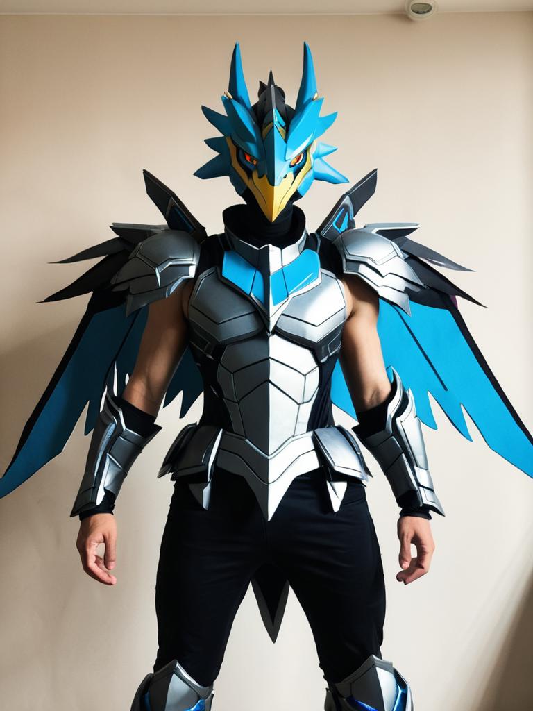 A man wearing a detailed and realistic Zekrom cosplay costume, featuring a blue and silver armored outfit with intricate helmet and wing designs, standing against a plain background.