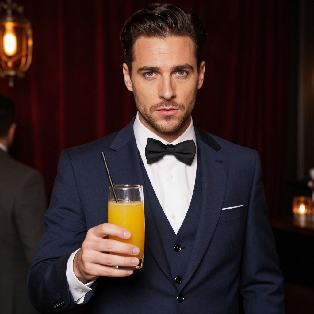Photograph of a handsome Caucasian man with short, dark brown hair and a trimmed beard, wearing a black tuxedo with a white dress shirt and black bow tie. He holds a glass of bright orange juice in his right hand, with a black straw. His blue eyes are focused on the camera with a serious expression. The background is dark with dim, warm lighting from a wall sconce, and a blurred figure in the left. The image has a sharp, vibrant quality with a rich color contrast.