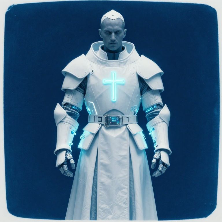 Cyanotype futuristic priest in white armor with robes and crucifix neon lights machines electronic lights on armor cinematic,