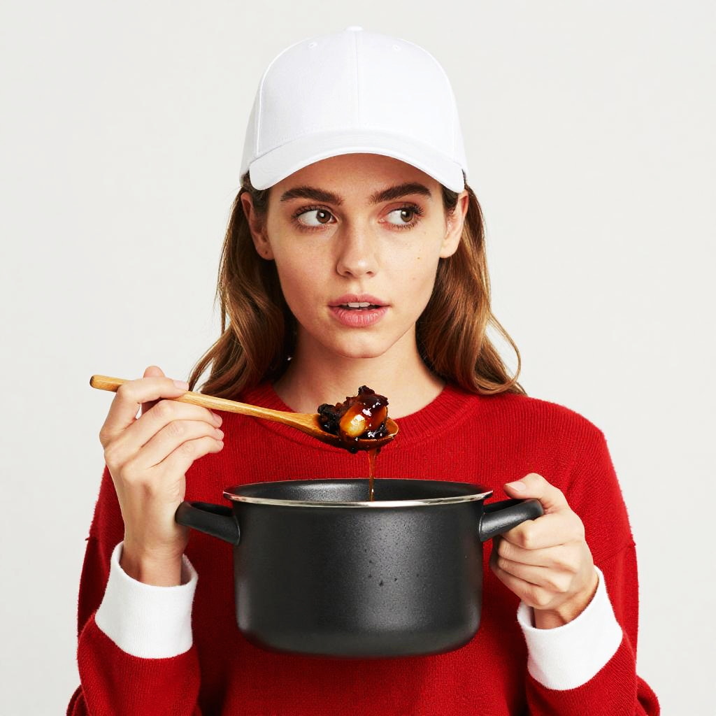 Photograph of a young woman with light brown hair and fair skin, wearing a white baseball cap and a red sweater with white cuffs. She's looking to the side with a slightly surprised expression while holding a black pot with her right hand and a wooden spoon with caramelized meat on it in her left hand. The background is a plain white, making her the focal point.