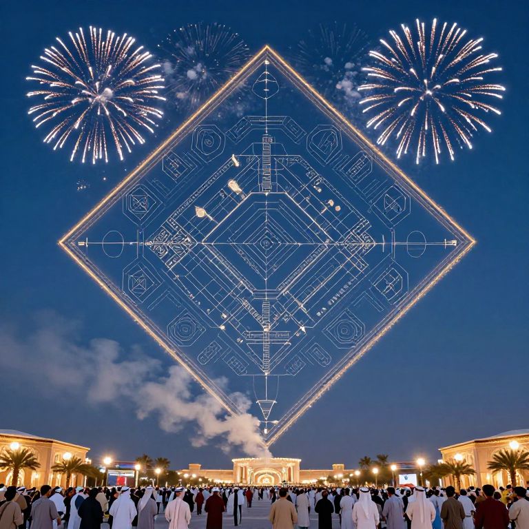 Floor Plan fireworks in the form of rhombus diamonds, festival, Arabian emirates, happy spectators, bluish colors, Realistic photography, Taken with canon D5 35mm, intricate detailing,