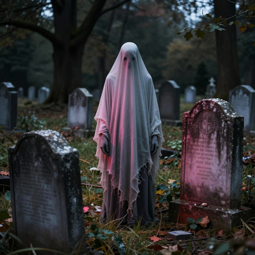 Photograph of a ghostly figure with a white, translucent sheet covering its head, featuring black, empty eyes, emerging from a dark, dilapid