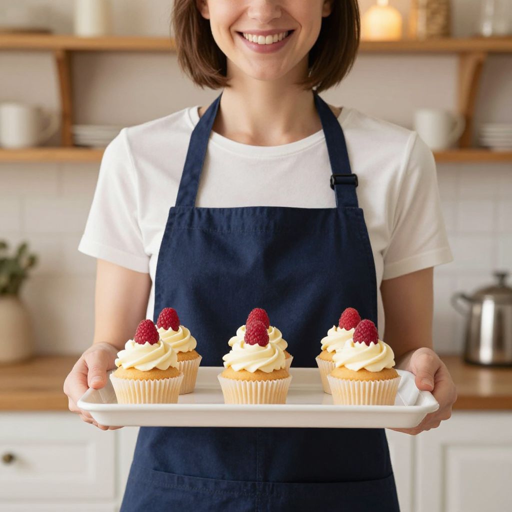 Smiling woman wearing a navy apron holds a white tray with six cupcakes, each topped with creamy frosting and a fresh raspberry, set against a cozy kitchen backdrop with warm lighting and wooden shelves.