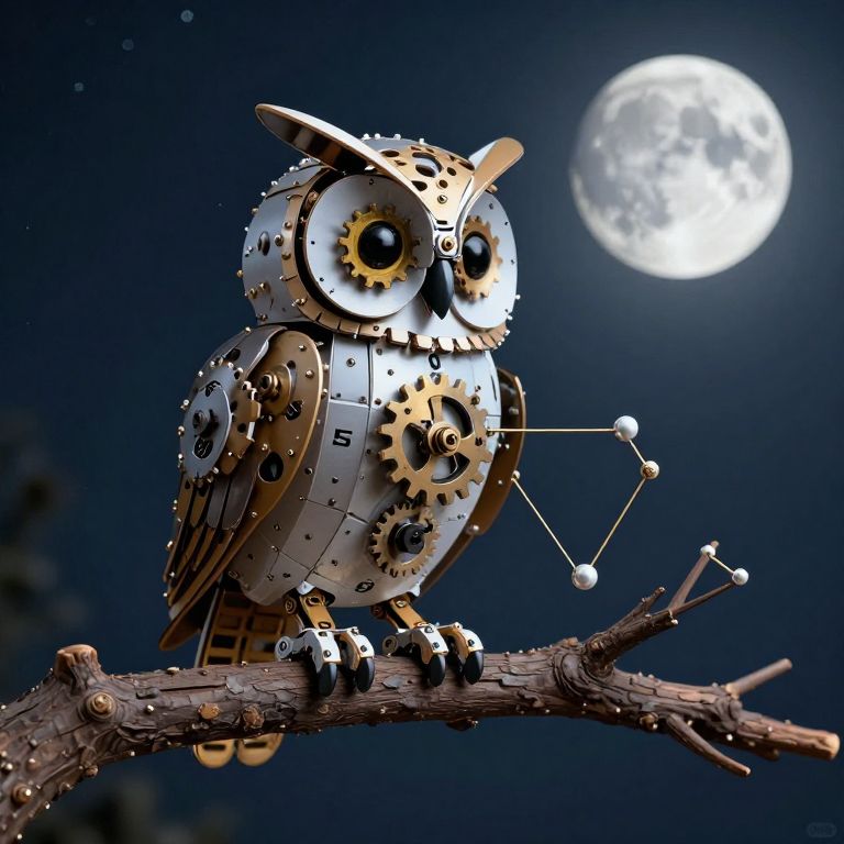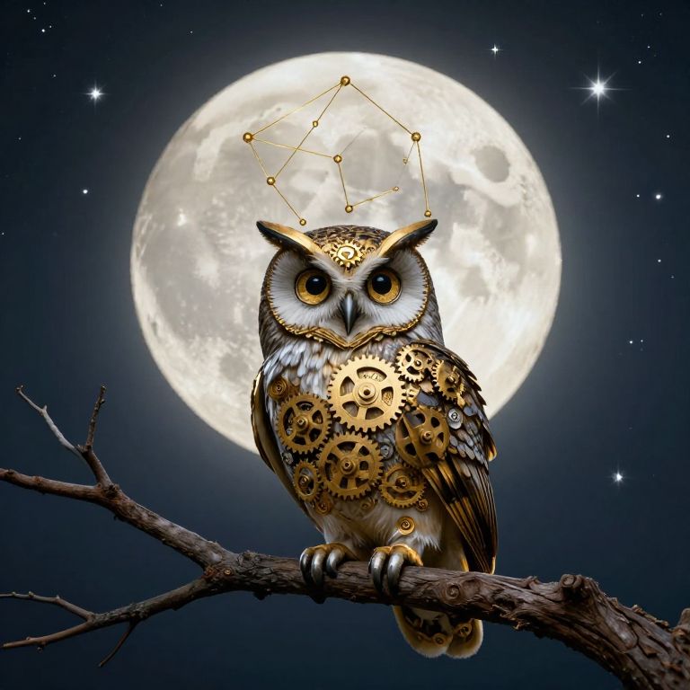 A clockwork owl perches on a moonlit branch, assembling and dismantling constellations with precision, each feather a gleaming gear.