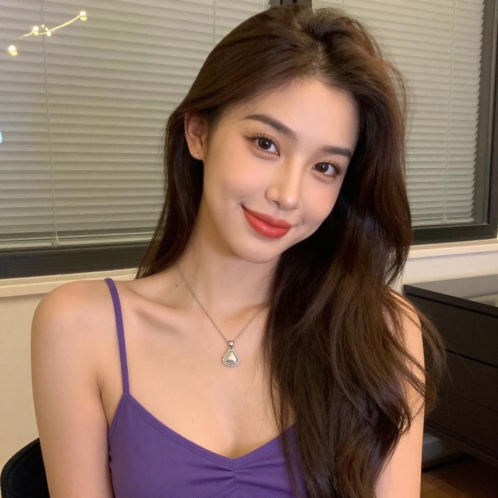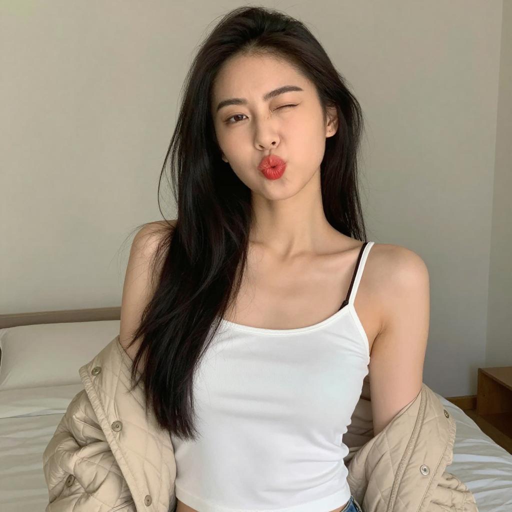 Photograph of an Asian woman with long black hair, red lipstick, and fair skin. She wears a white tank top, black high-waisted jeans, and a beige quilted jacket, partially off her shoulders. She stands in a white-walled bedroom with a bed, wooden nightstand, and a hanging fringe bag. She looks directly at the camera with a slight smile.