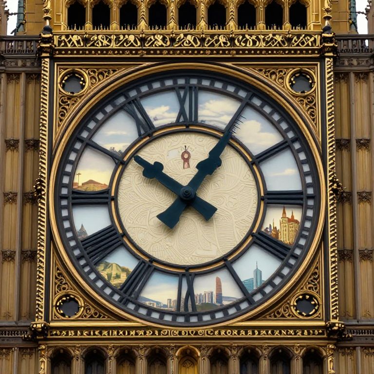 Photograph of the iconic clock face of Big Ben, located in the Elizabeth Tower. The clock features a large, circular design with black Roman numerals and ornate gold detailing. The clock hands are black and point to approximately 10:10. The clock face reflects various London landmarks, including the Tower of London and St. Paul's Cathedral, visible through the transparent glass segments. The surrounding architecture is intricately designed with Gothic elements, including pointed arches and decorative patterns. The colors are predominantly gold, black, and blue, with the reflections adding a touch of green and gray from the cityscape.