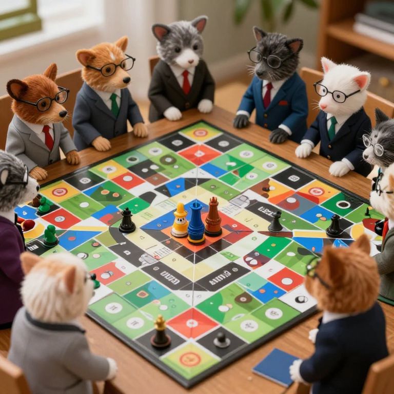 Digital illustration of six anthropomorphic cats in business suits playing a colorful board game at a wooden table. Cats wear glasses, and the game board features vibrant