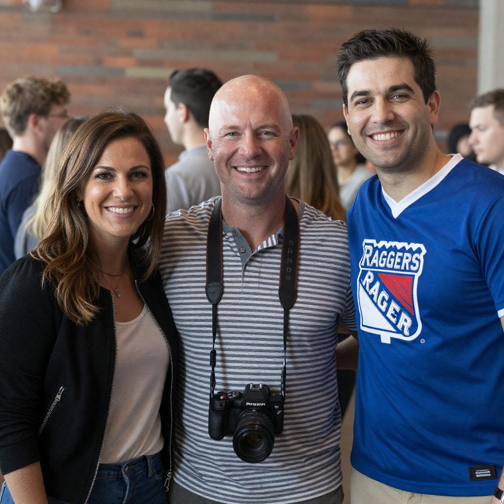 Photograph of a group of smiling people. Center: bald man in striped shirt holding a camera, flanked by a brunette woman in a black jacket on the left and a dark-haired man in a blue "Rangers" shirt on the right. Background: blurred crowd and brick wall. Bright, indoor lighting.