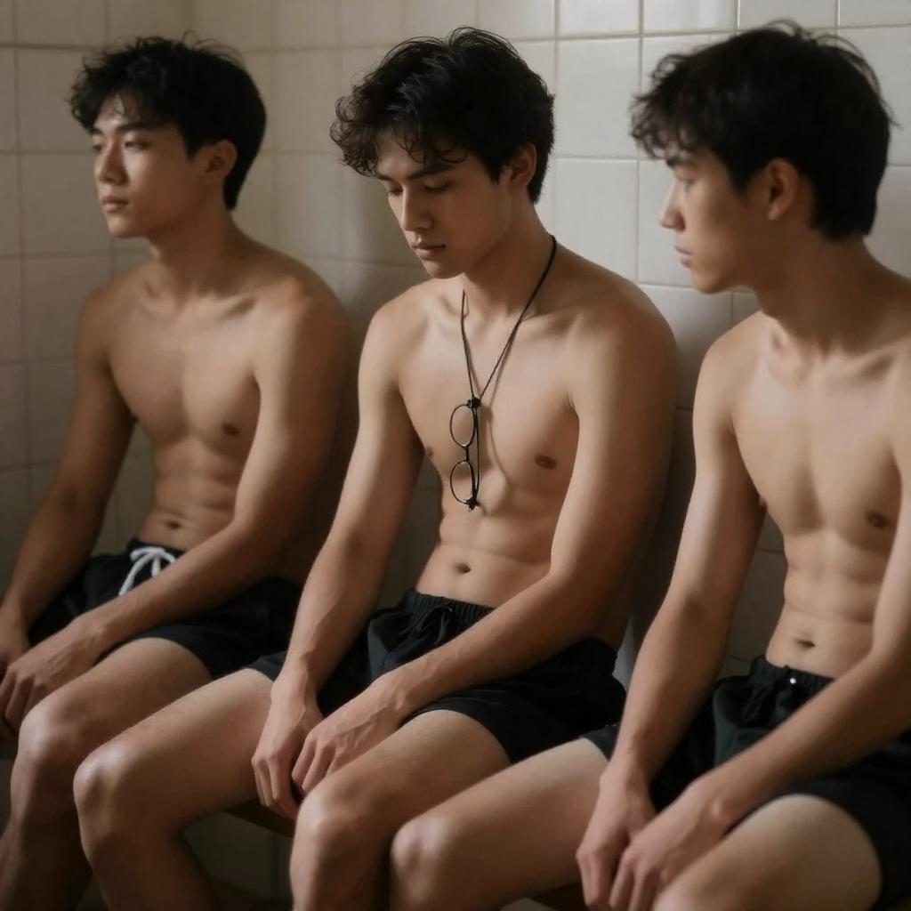 Photograph of two young men standing close, facing each other. The shirtless man on the left, with short dark hair and a muscular build, gently touches the chin of the man on the right, who has short brown hair, wears a gray sleeveless shirt, and holds a green object. Bright sunlight illuminates their faces, with a blurred outdoor background.