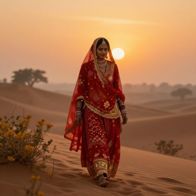 Indian girl walking through a misty hillside in Rajasthan, dressed in a red and gold dupatta with floral motifs, golden sunset behind her, traditional jewelry, natural landscape with sand dunes and desert flora, ultra-realistic, rich colors, dramatic contrast.