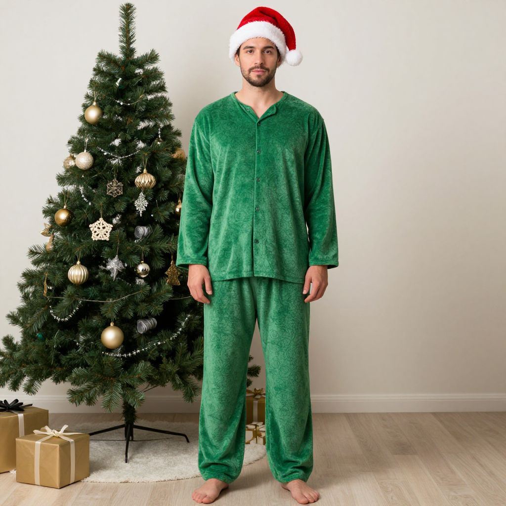 Green Christmas Pants Costume, man in a green christmas pajamas and santa hat standing in front of a christmas tree