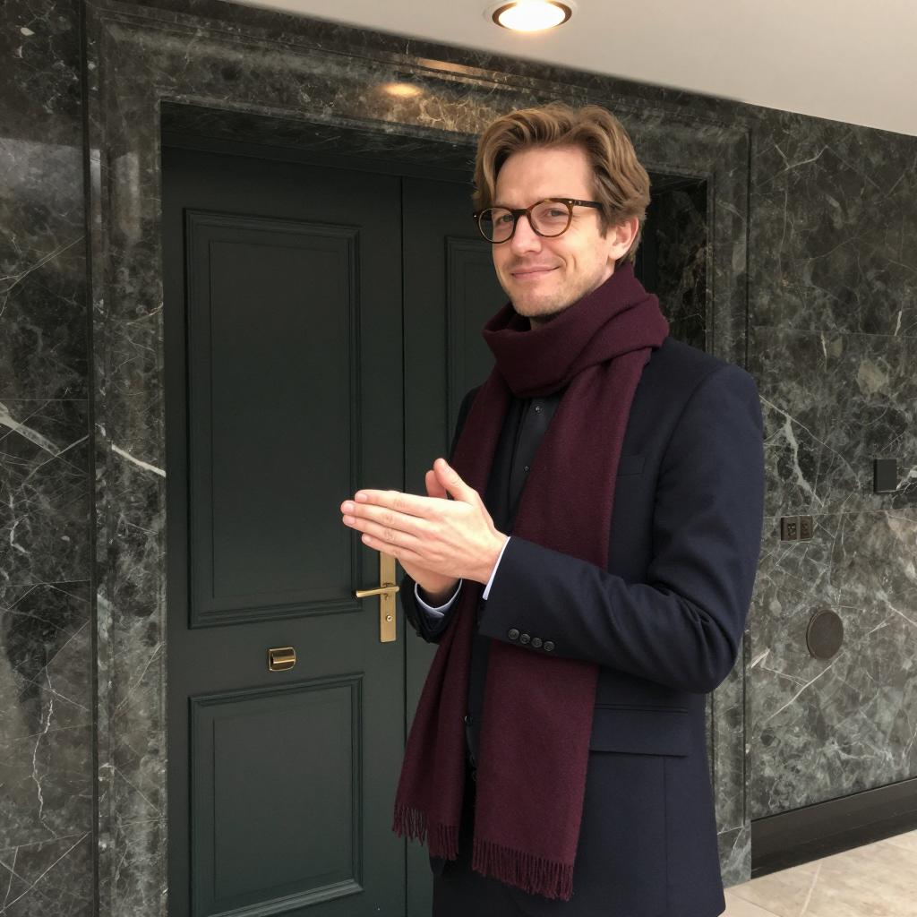 Man with light brown hair, wearing dark suit, maroon scarf, and glasses, stands in front of a dark green marble door. He holds his hands together, smiling slightly. The background features dark green marble walls and a lit ceiling light. The setting is an indoor hallway.