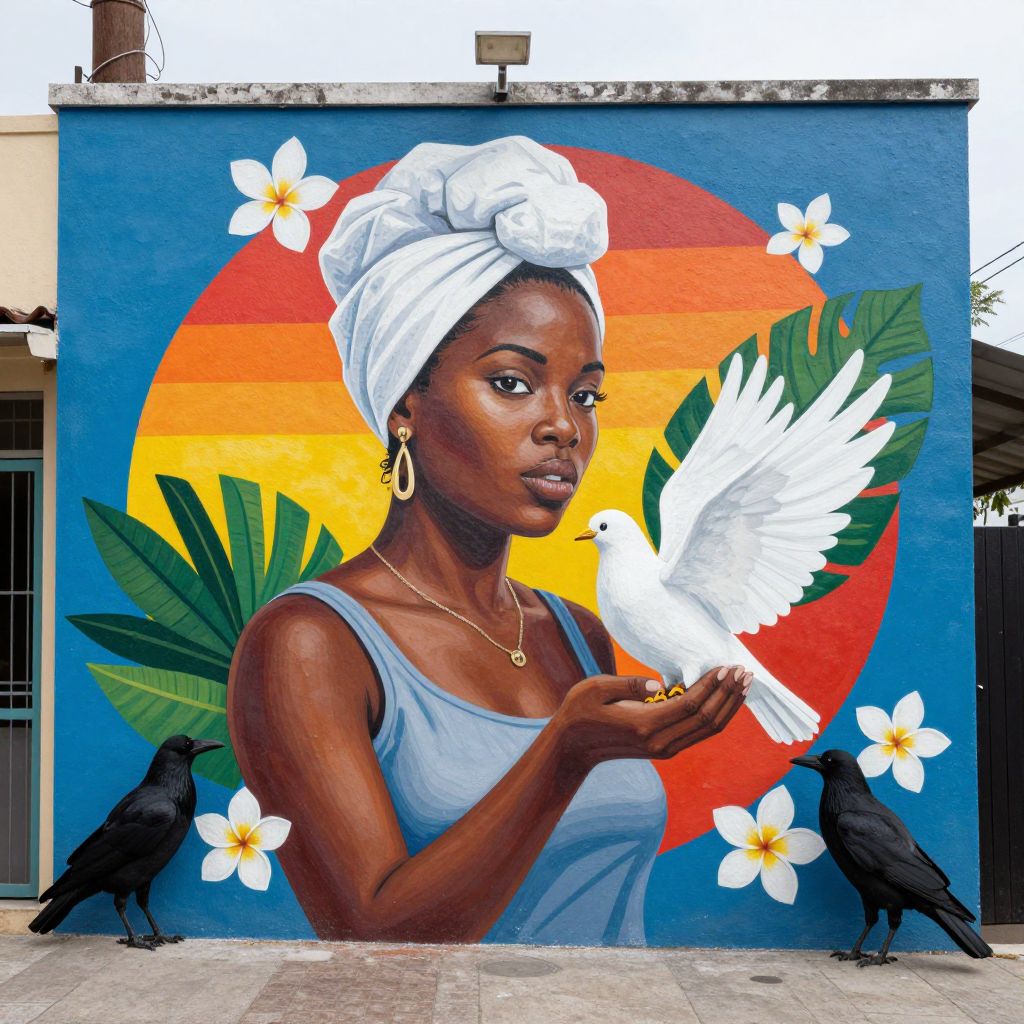 Vibrant mural of a dark-skinned woman with white headwrap, pink strapless top, holding white dove, surrounded by black crows,