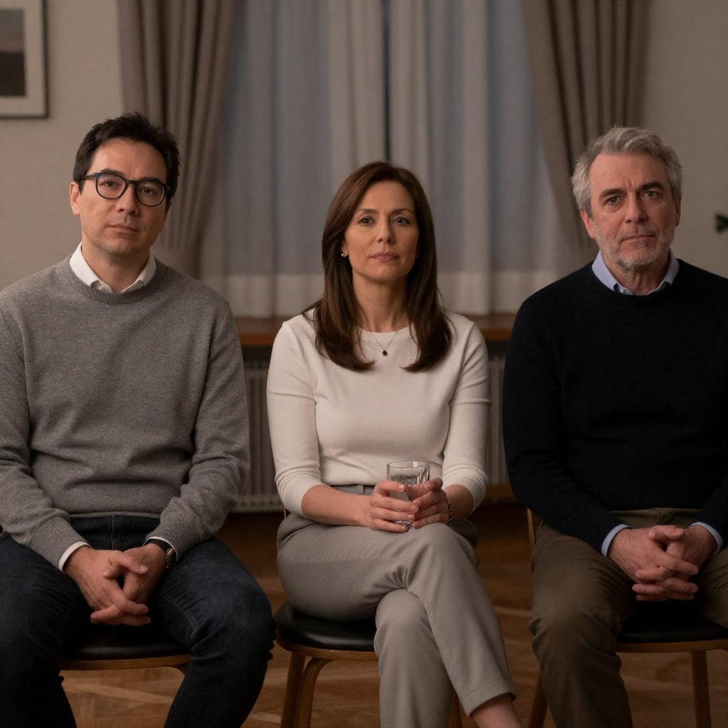 Photograph of three adults in a dimly lit room. A man with glasses and dark hair in a gray sweater sits on the left, a woman with brown hair in a white top and gray pants sits in the center holding a glass, and a man with gray hair in a black sweater sits on the right. A window with curtains is in the background.