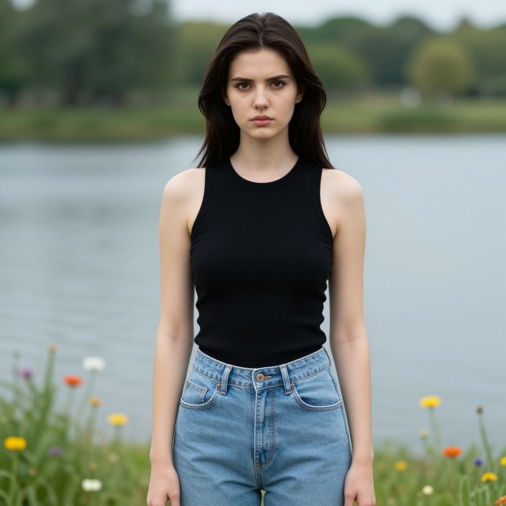 Photograph of a young woman with long black hair standing in a bright meadow. She's wearing a white crop top and high-waisted white shorts, showing her toned midriff. She has a tan skin tone, dark eyes, and hoop earrings. The background features a blurry lake and greenery with colorful wildflowers. She's looking directly at the camera with a neutral expression.