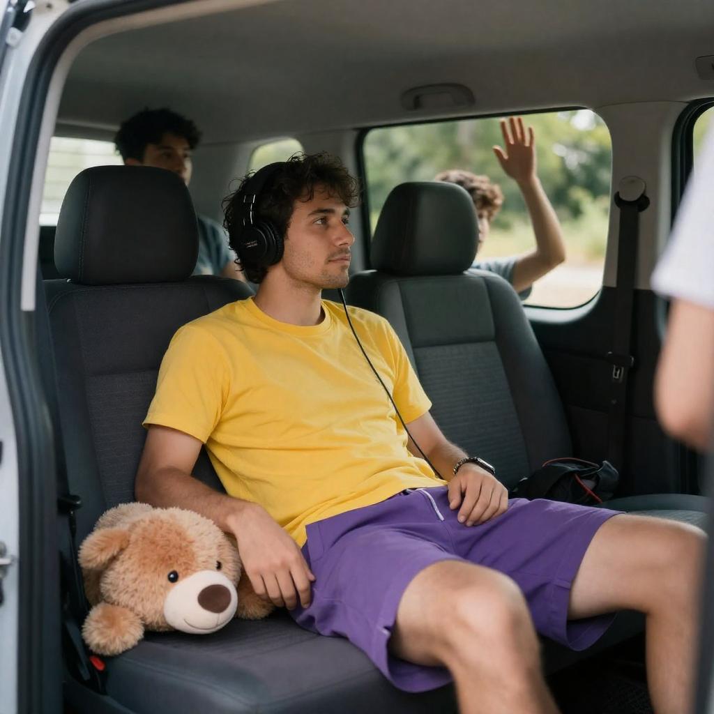 Photograph of a man in a yellow shirt and purple shorts, reclining in a van's backseat with headphones, looking outside. A large stuffed animal rests beside him. Two other people are visible through the van window, one with raised hands. A third person, partially visible, leans over from the front. Sunlight filters through the van's windows.