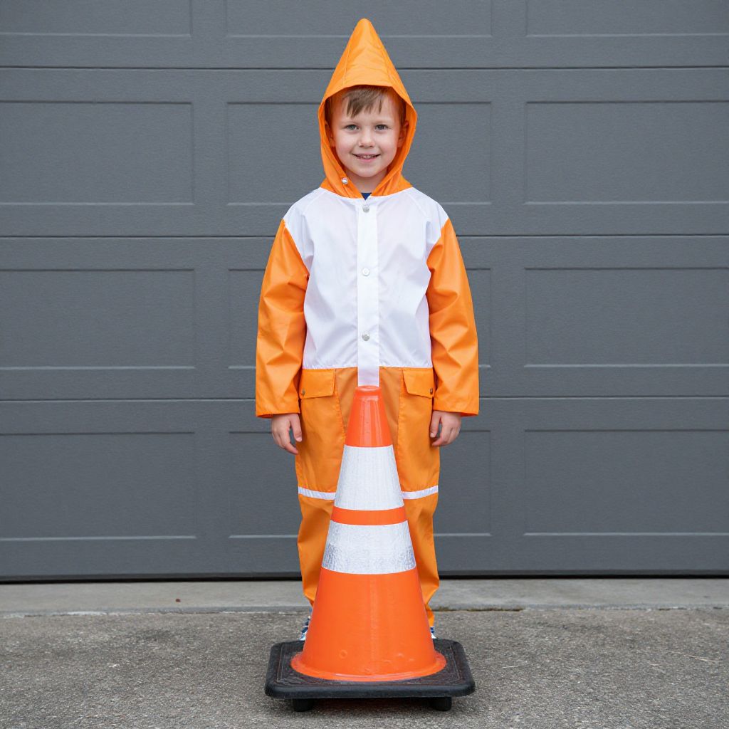 Traffic Cone Fancy Dress Costume, boy in an orange and white raincoat standing in front of a garage