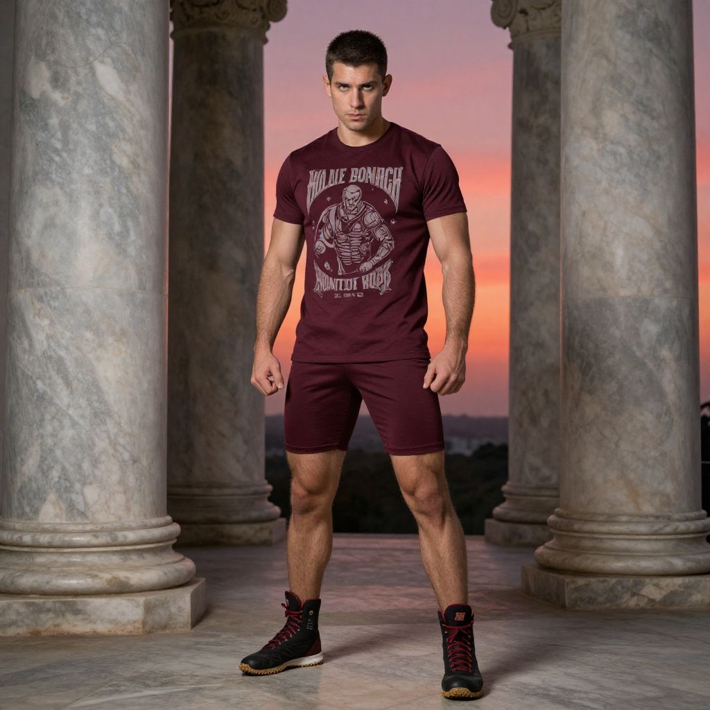 A man, graphic print muscle tee, deep burgundy fitted stretch shorts, high-traction boxing shoes, standing among majestic marble columns, intricate carvings, vibrant sunset backdrop, calotype process, focused expression. Man has masculine face and piercing eyes