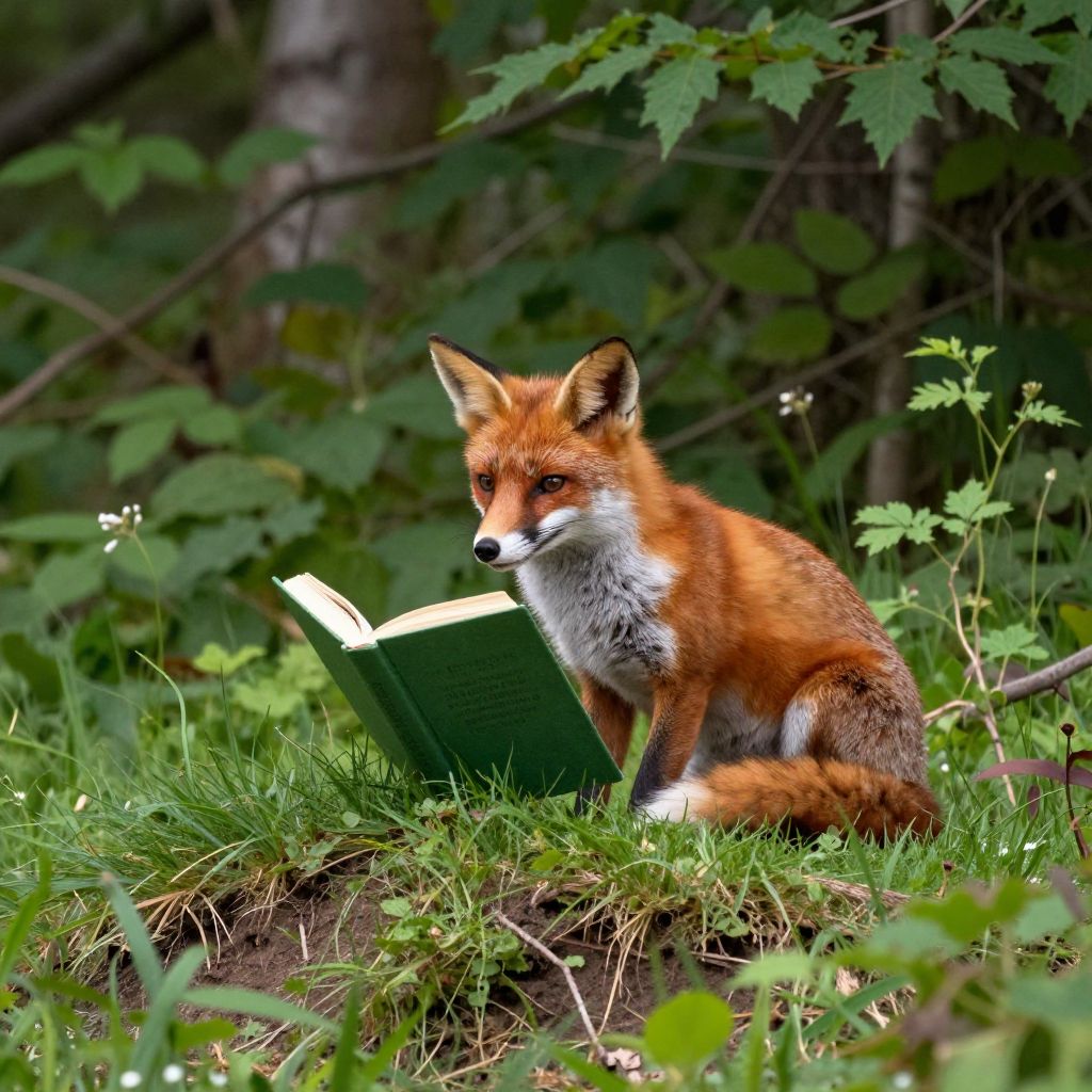 Photograph of a red fox with white underbelly sitting on green grass, reading an open green book in a lush forest.