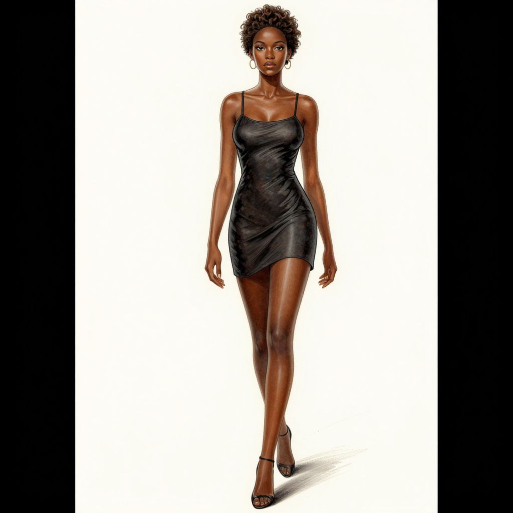 Photograph of a tall, slender Black woman with dark skin and short, curly black hair, walking confidently on a white background. She wears a tight, black, satin mini-dress with thin straps, highlighting her slender arms and long legs. She also wears black high-heeled sandals. Her expression is serious and focused. The white background contrasts sharply with her dark dress and skin, making her the central focus of the image. The lighting is bright and even, emphasizing the smooth texture of the satin dress and her toned physique.