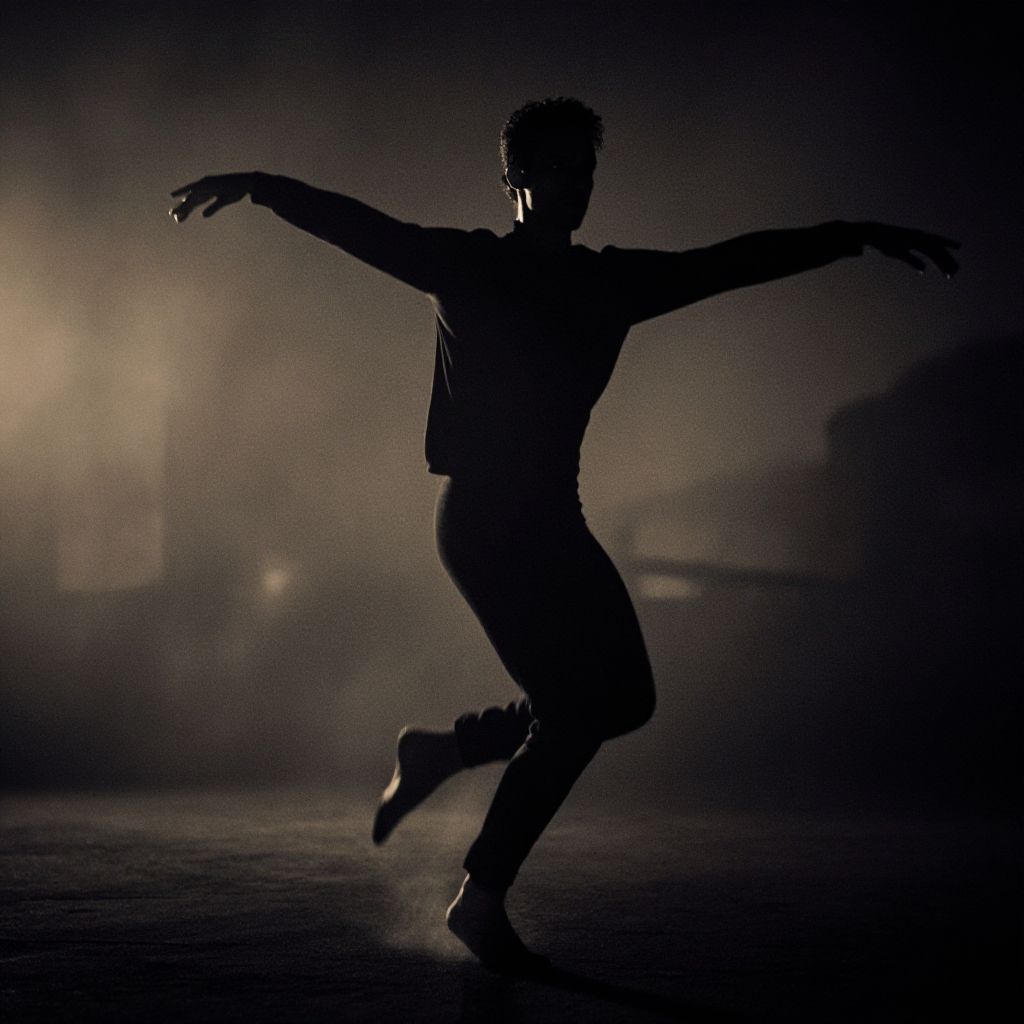 High contrast, moody night scene, a lone figure in motion, arms outstretched, legs fluidly moving to an unseen rhythm. Bleach bypass effect applied, desaturated colors, deep shadows accentuate the dancer's outline, ethereal atmosphere, mysterious energy emanates from his silhouette, as if dancing on air. Man has masculine face and piercing eyes