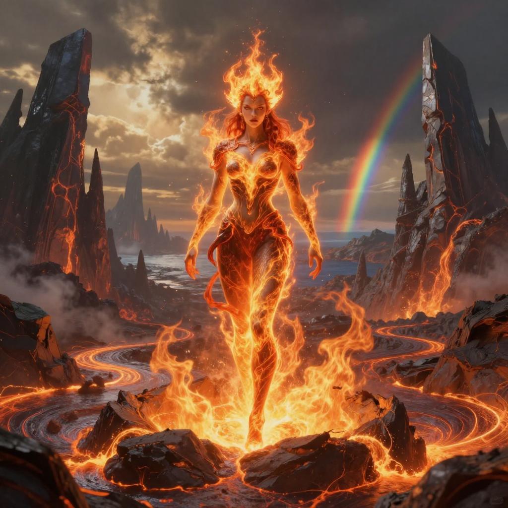 Modelshoot style, (extremely detailed CG unity 8k wallpaper), full body shot of elemental fire mage queen, volcanic island caldera at golden hour with rivers of molten lava, towering obsidian spires, ash-flecked amber sky and a faint double rainbow over the sea, professional majestic oil painting by Greg Rutkowski and Kinuko Y. Craft, Studio Ghibli, trending on ArtStation and CGSociety, intricate, high detail, sharp focus, cinematic lighting, photorealistic art by midjourney and Greg Rutkowski