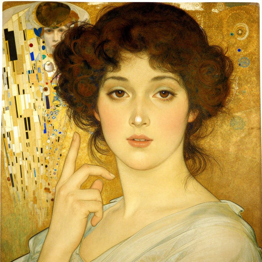 This digital artwork depicts a young woman with fair skin and dark, curly hair against a golden, textured background. She has large, expressive brown eyes and slightly parted lips, with a serene yet inquisitive expression. She wears a loose, white garment with a soft texture. Her right hand is raised, with two fingers gently touching her cheek. In the background, there are abstract, rectangular and circular patterns in shades of blue, black, and gold, partially obscuring a blurred portrait of another woman with similar features. The overall style combines realism with Art Nouveau elements, characterized by intricate lines and a golden hue.