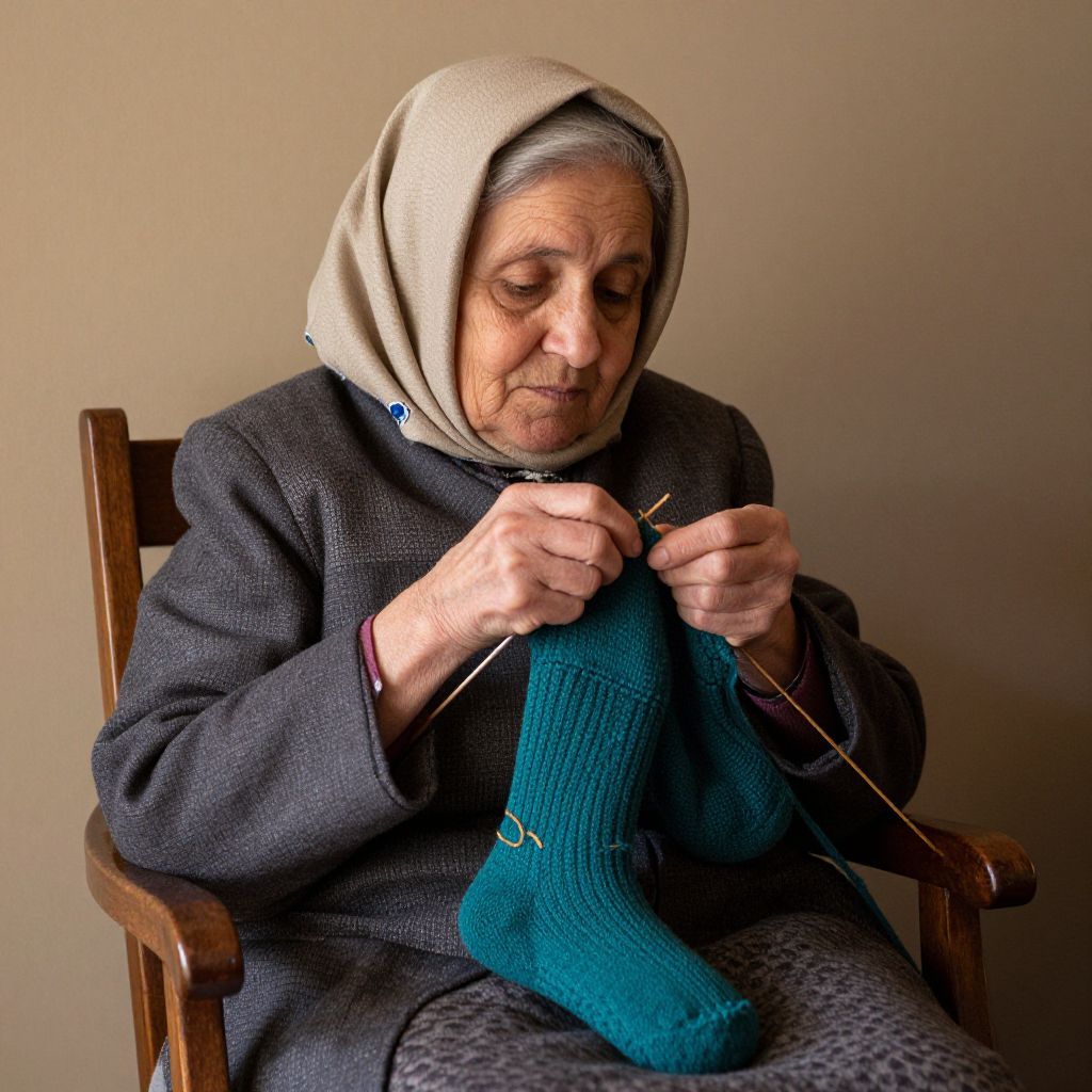Elderly woman seated in a wooden chair, intently knitting a teal sock while wearing a beige headscarf and layered garments, evoking a timeless scene of domestic craftsmanship.